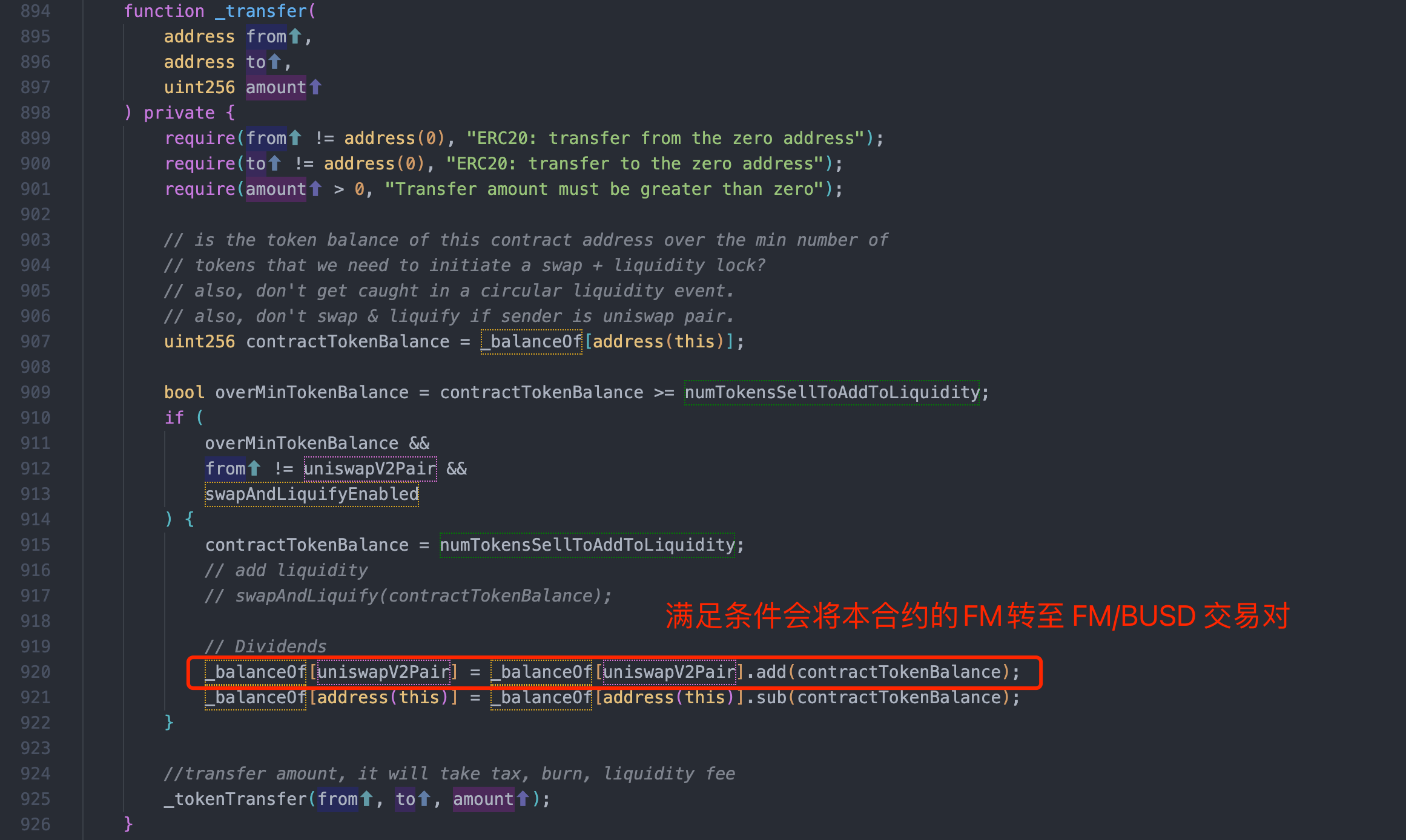 漏洞核心在于 FM 代币合约的转账逻辑中,若 FM 代币合约大于numTokensSellToAddToLiquidity,则会触发进一步逻辑将其所有 FM 代币转至 FM/BUSD 交易对
