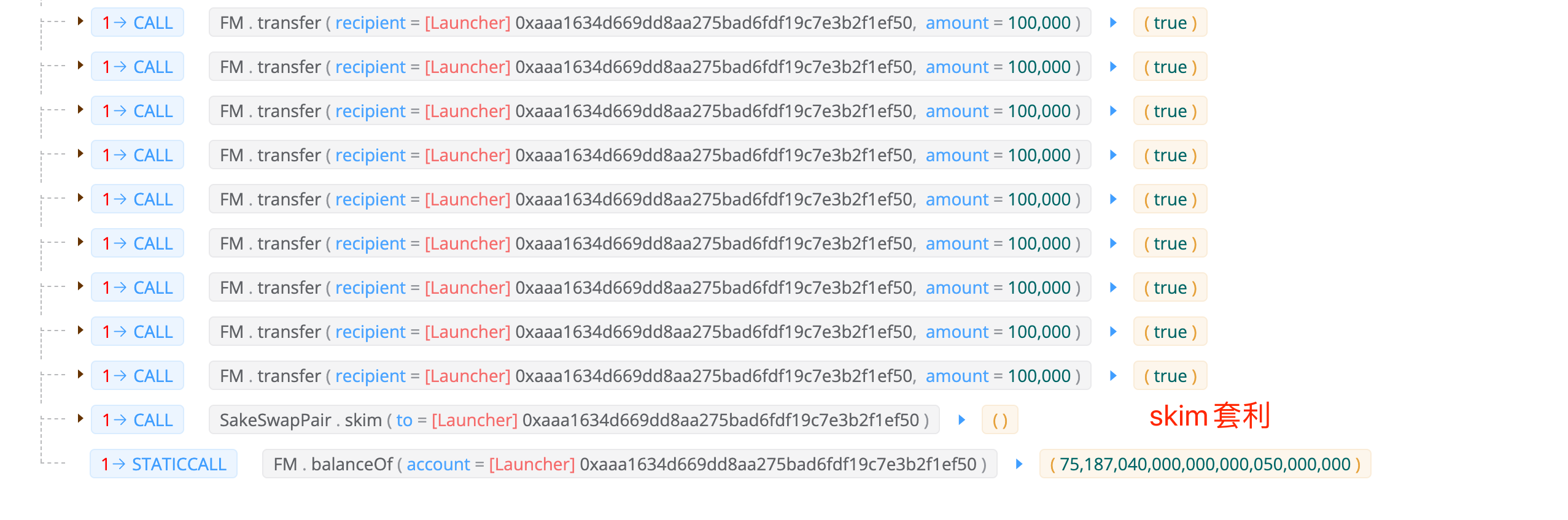 随后调用 FM/BUSD 交易对的skim函数套利离场
